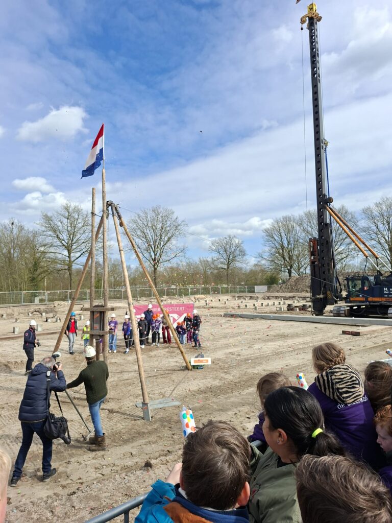 Dat de bouw van Kindcentrum Wijhe nu echt is begonnen, werd vanmiddag feestelijk gevierd op de bouwplaats. Kinderen van de Bieënkorf, de Wije en Mijnpleinschool Wijhe sloegen symbolisch de eerste paal in de grond. “Een echte mijl-paal”, aldus één van de directeuren.